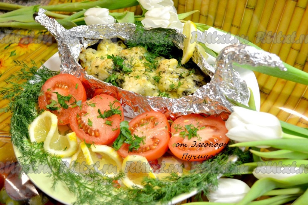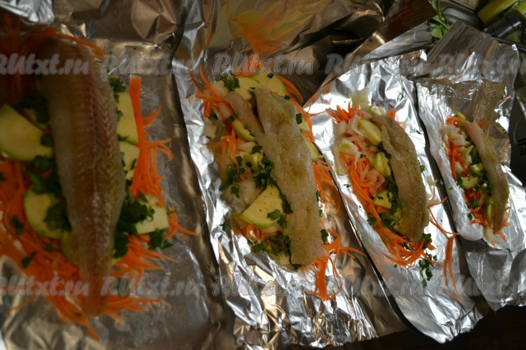 Разделяем фольгу на прямоугольники и в центр фольги выкладываем наши овощи и рыбу в следующем порядке: морковка, натёртая соломкой, затем порезанные лук, кабачок, филе рыбы, сверху цветная капуста и зелень, соль, немного поливаем маслом подсолнечным.