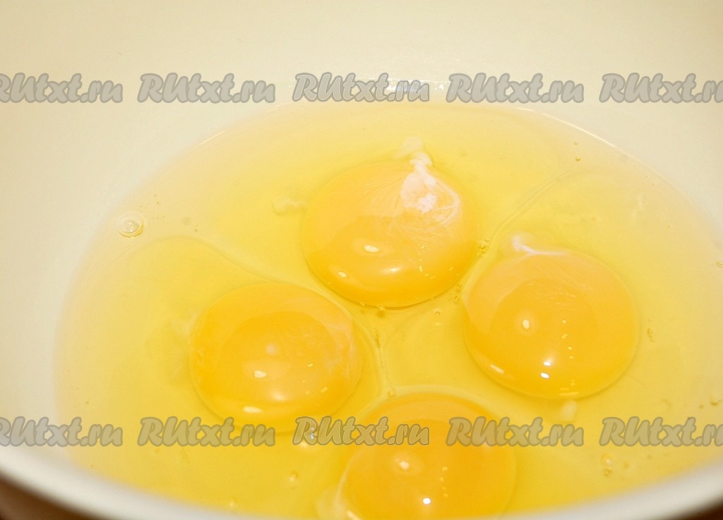В миску выбить яйца. Взбить с помощью миксера до гладкой и пышной массы.