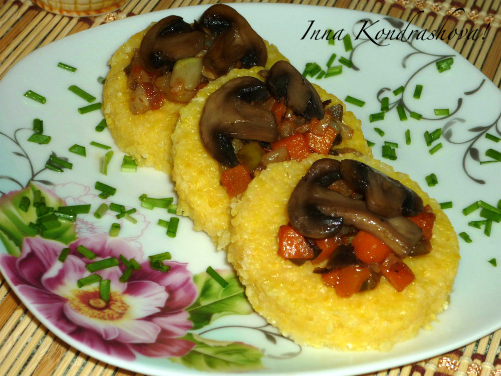 На кружок приготовленной поленты сверху выложить 1 чайную ложку овощной смеси, сверху положить грибы. Посыпать зелёным луком.
