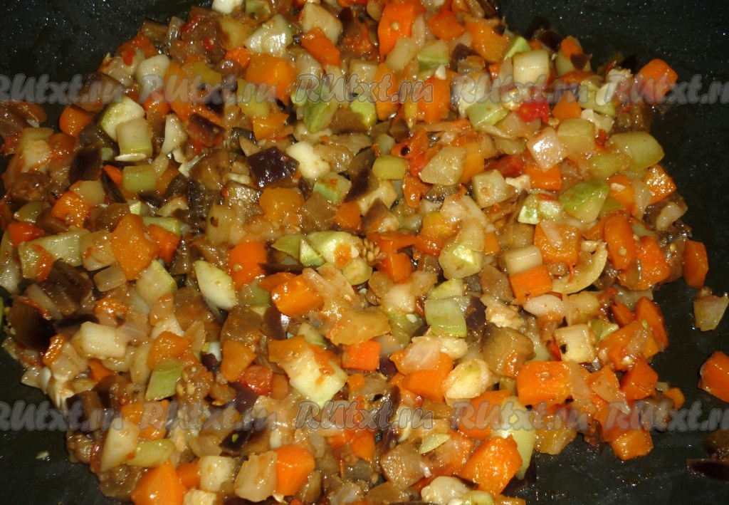 Овощную смесь поместить на разогретую сковороду с оливковым маслом. Тушить до испарения жидкости.
