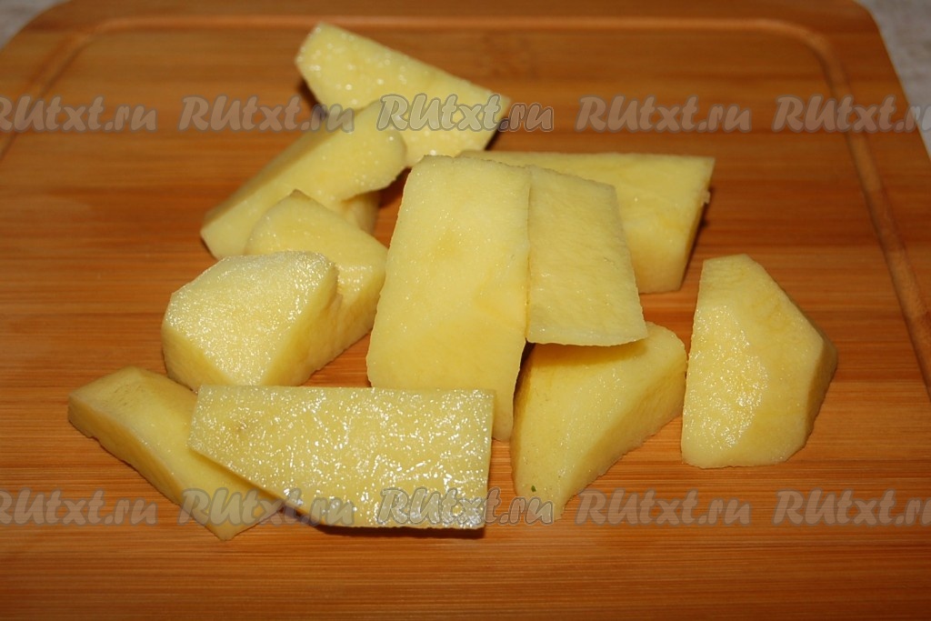 Картофель почистить, нарезать не очень крупно и через 1,5 часа от начала варки мяса добавить в кастрюлю.