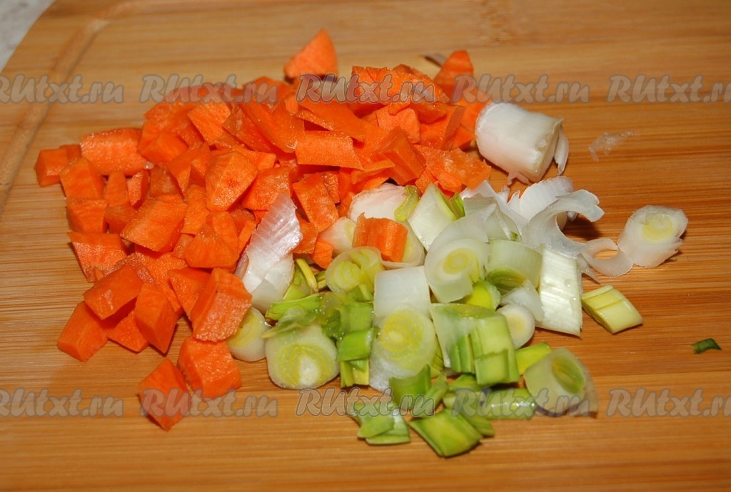 Морковь и лук нарезать мелко и через 15 минут после картофеля добавить в кастрюлю.
