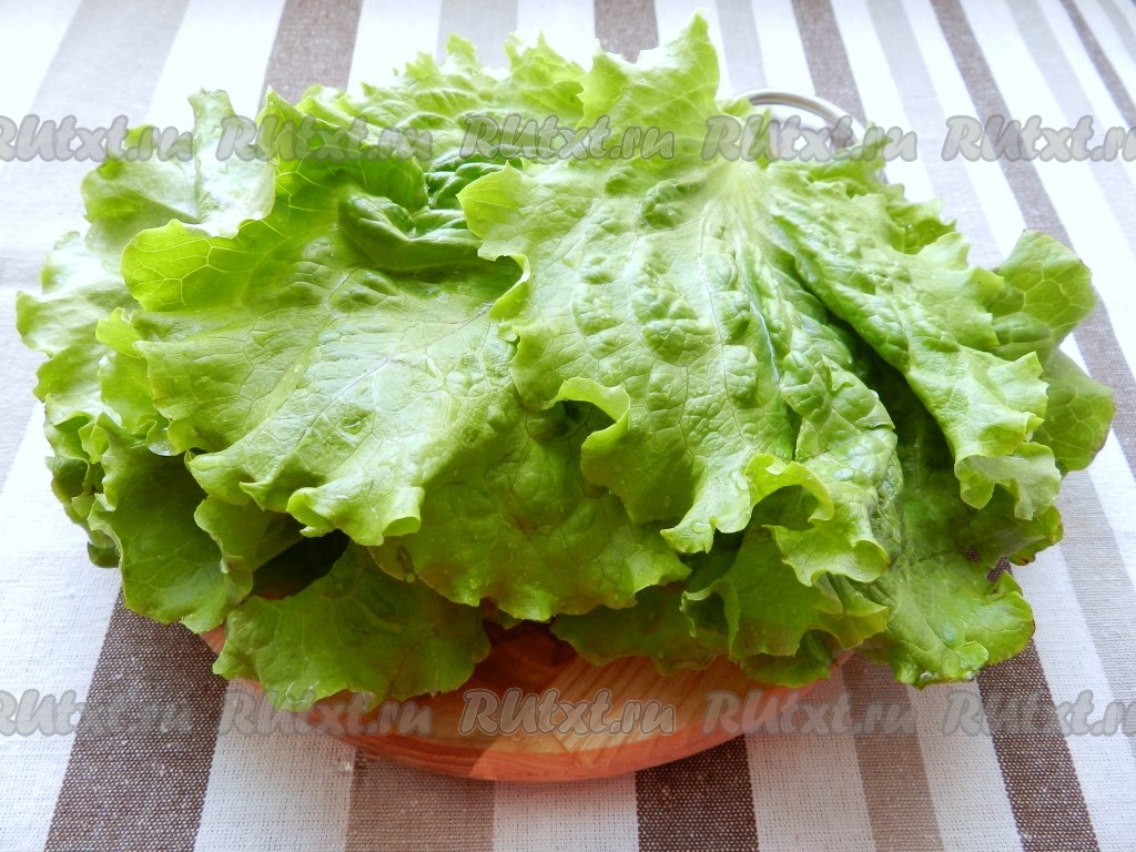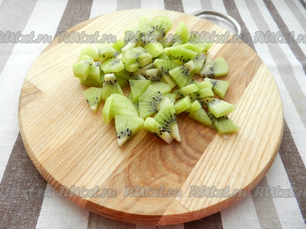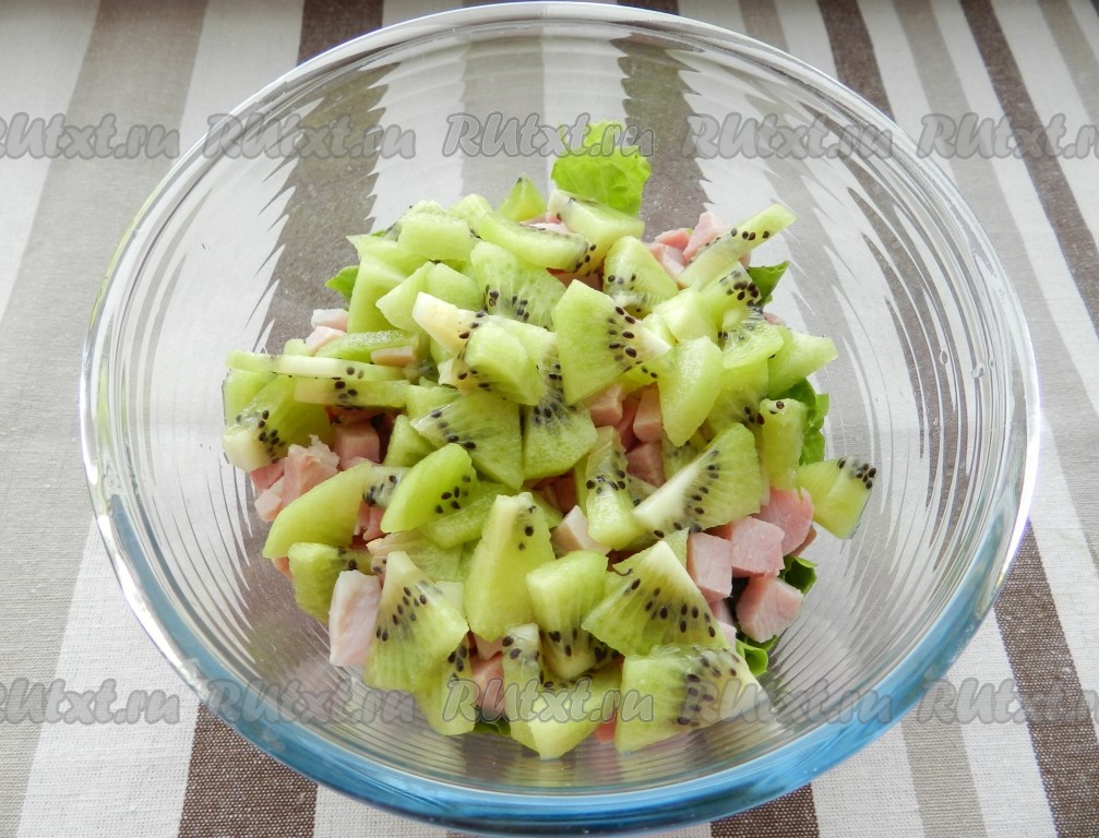 Листья салата нарезать или порвать руками, сложить в салатник, добавить нарезанное мясо и киви, перемешать.