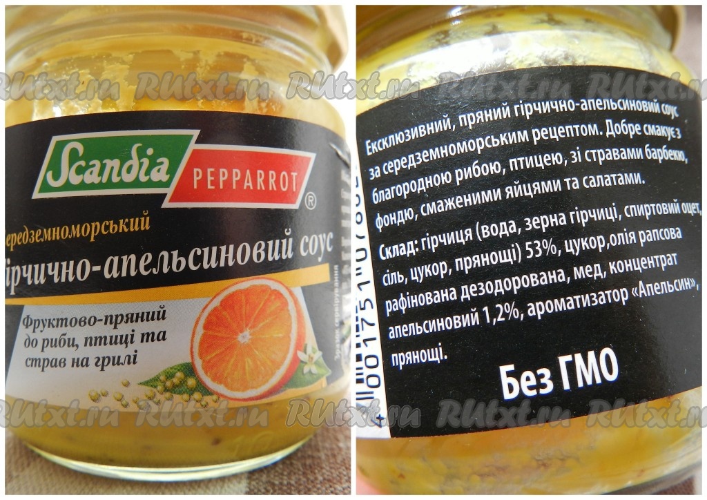 Для заправки "Оригинального" салата я использовала готовый горчично-апельсиновый соус, в состав которого входит неострая горчица, сахар, рапсовое масло, мед, апельсиновый концентрат и специи.