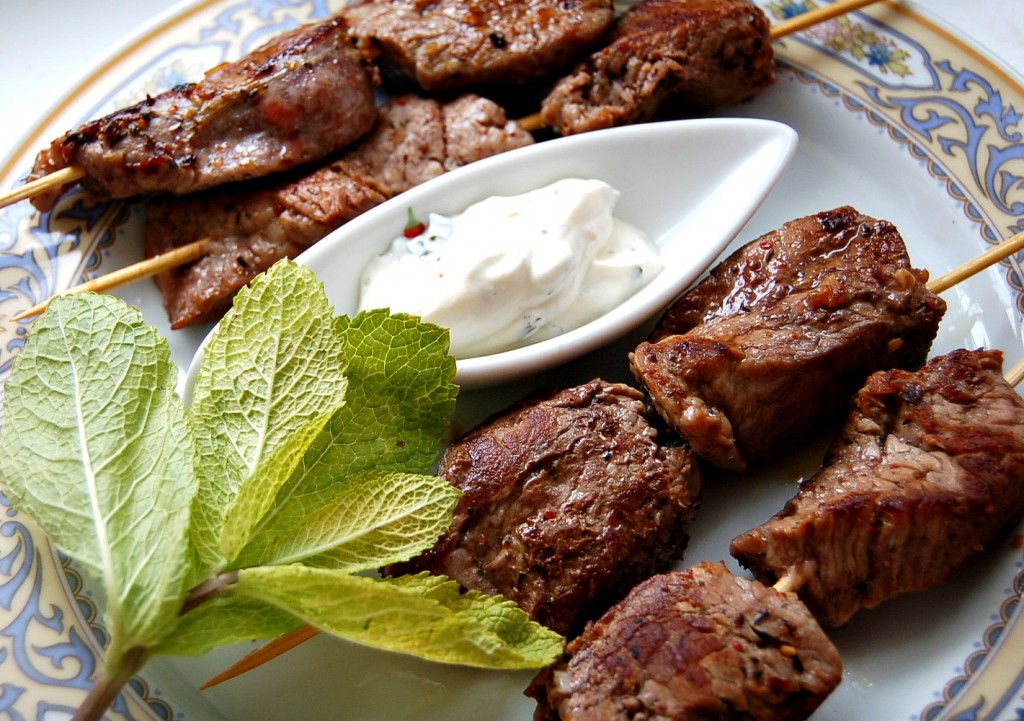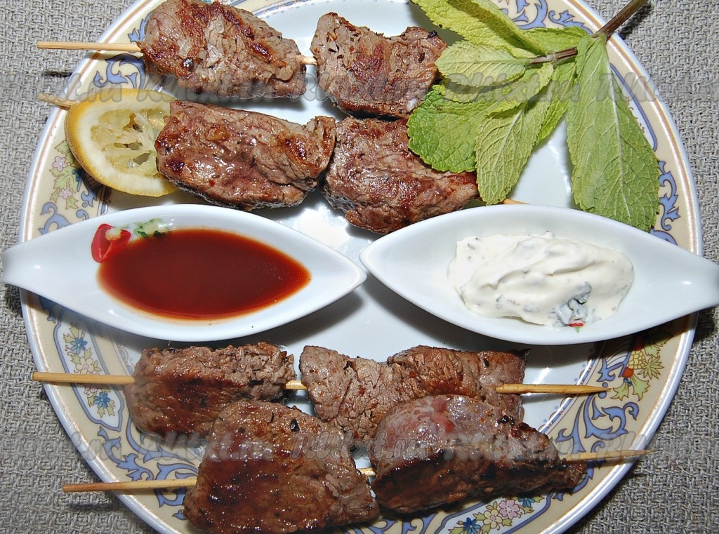 Кебабы, по сути своей, представляют из себя шашлыки, но с небольшими восточными нотками, проявляющимися в составе маринада для мяса. Чаще всего для кебабов используют баранину, реже говядину, свинину или курицу. В качестве дополнения подают свежие овощи, зелень и соусы. Для приготовления кебабов понадобятся деревянные (обычно бамбуковые) шпажки, которые предварительно нужно обязательно минут на 30 замачивать в холодной воде. Готовить кебабы можно в духовке, на гриле или в обычной сковороде. Сегодня будем жарить кебабы из говядины на сковороде. Блюдо получается сочным, ароматным и очень вкусным!