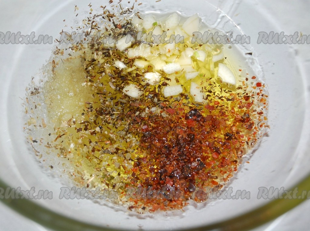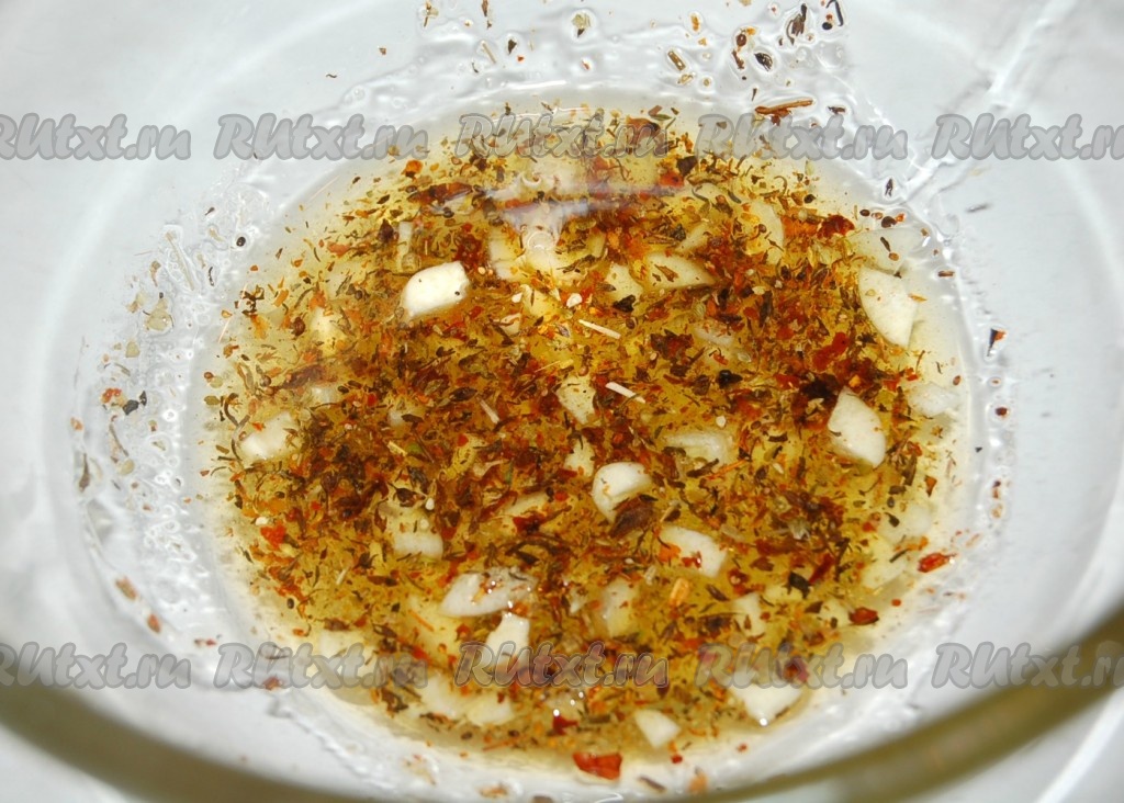 Чеснок очистить и нарезать на тонкие дольки. В миску влить оливковое масло и свежевыжатый сок лимона, добавить сушёные специи, чёрный молотый перец, дольки чеснока и соль.