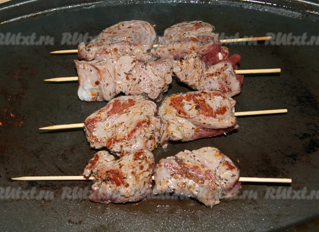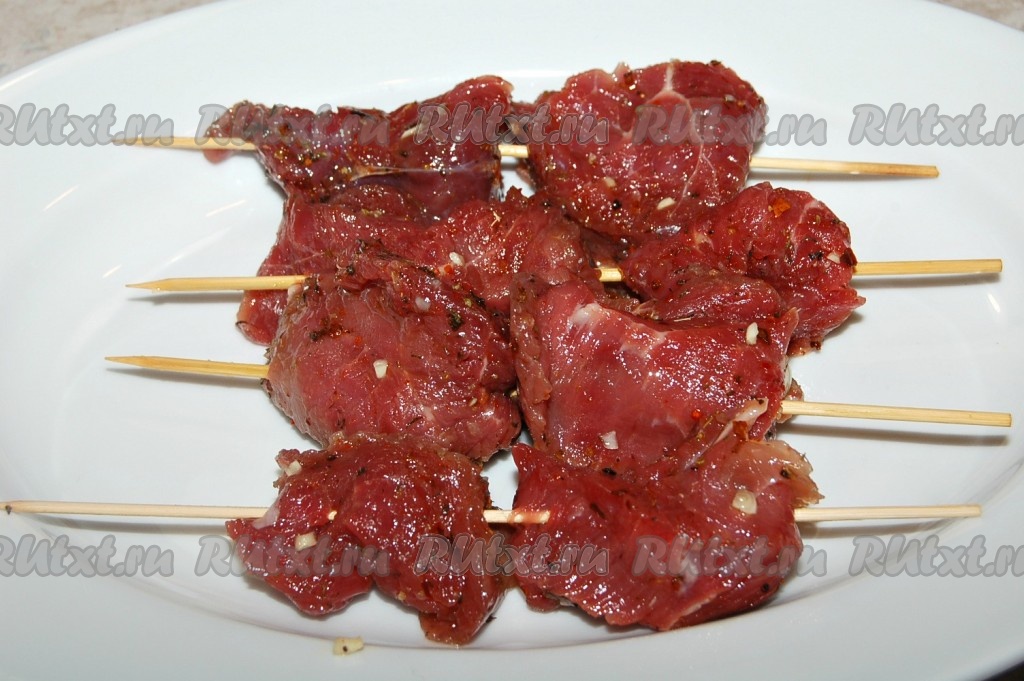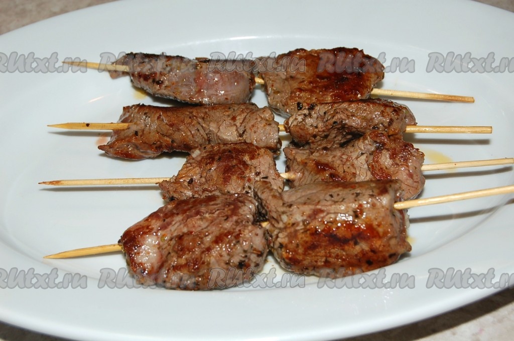 Разогреть гриль или обычную сковороду, поместить кебабы на шпажках и жарить их, всё время переворачивая, чтобы они равномерно прожарились на среднем огне. На обжаривание требуется, как правило, от 15 до 25 минут. Всё зависит от качества говядины. Масло добавлять не нужно, так как кебабы мы мариновали с использованием масла.