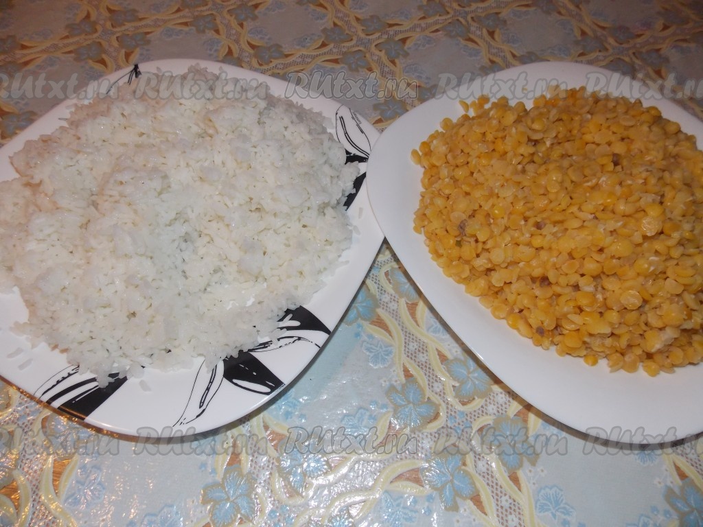 Горох и рис отварить до готовности, остудить.