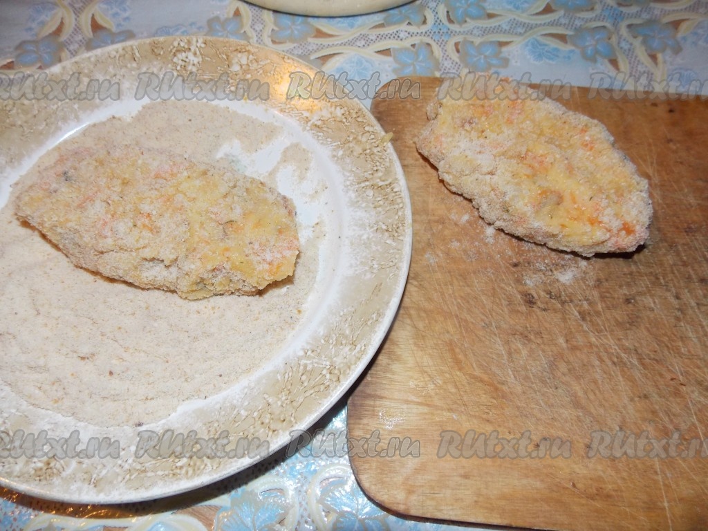 Сформировать котлеты и обвалять их в панировочных сухарях.