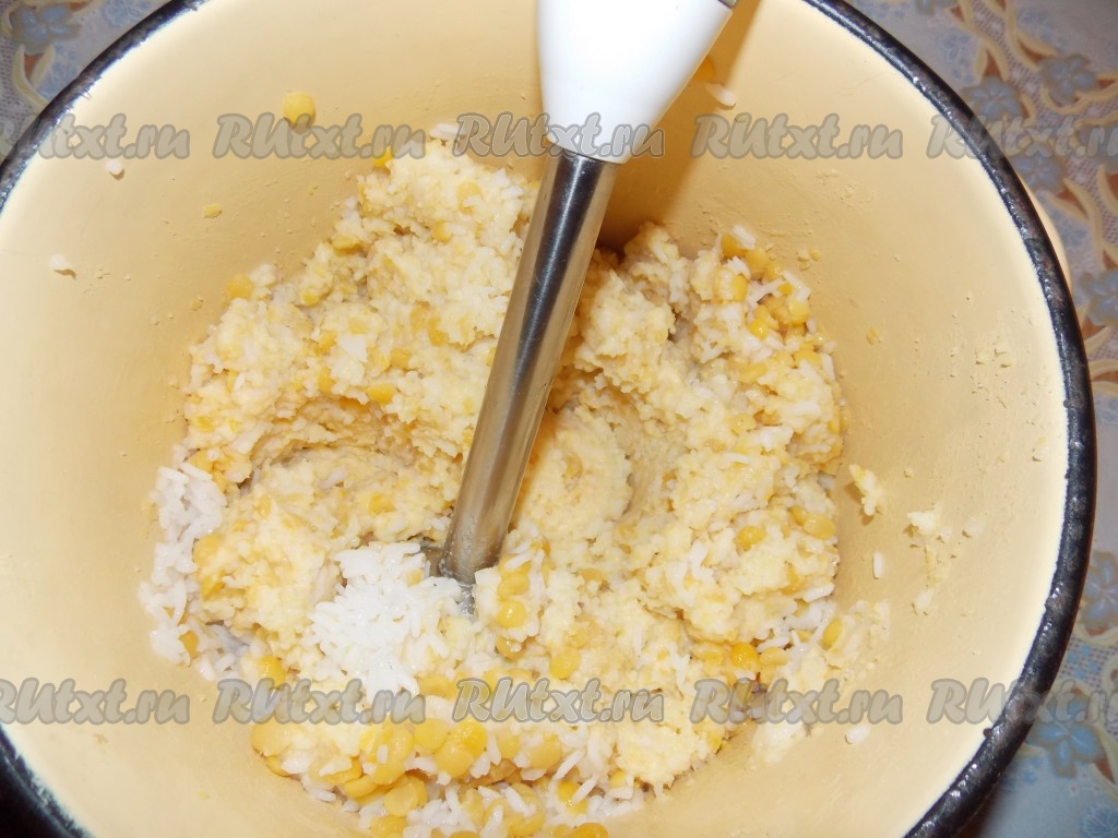 Смешать рис и горох, пюрировать с помощью блендера (или пропустить через мясорубку).