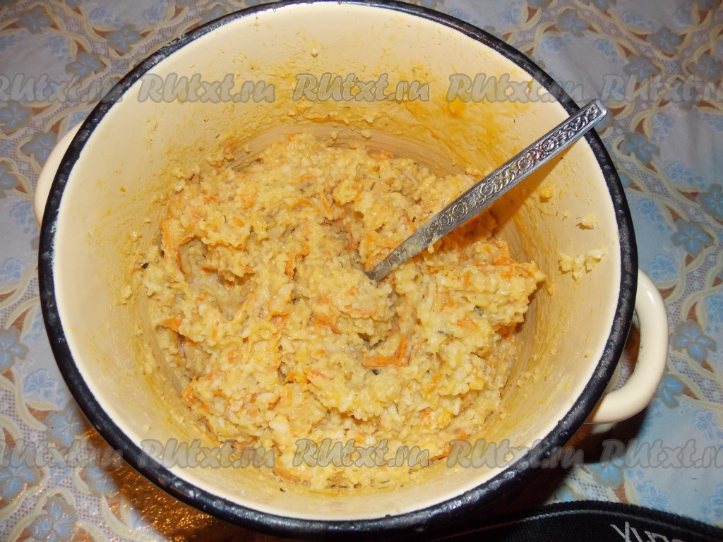 Добавить к пюре из гороха и риса морковь, а затем - лук и чеснок. Полученную смесь перемешать, добавить яйцо, сухой укроп, посолить, поперчить.