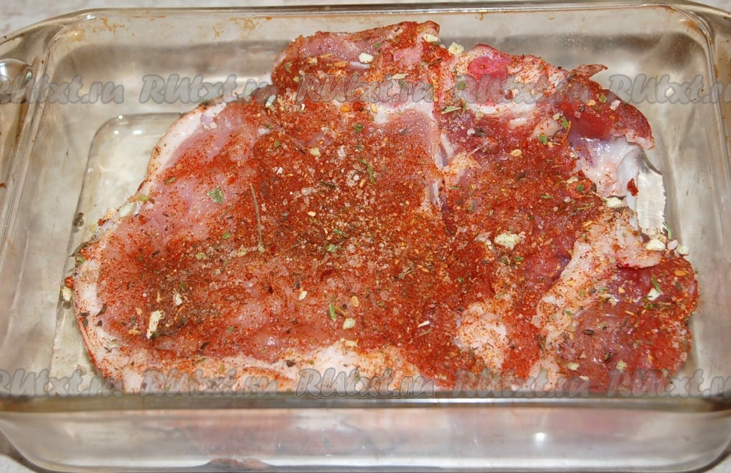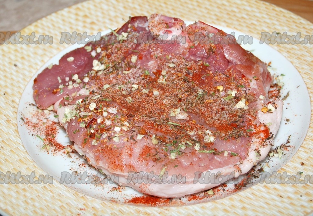 Свиную отбивную обвалять в смеси соли и специй. Стараться, чтобы смесь равномерно распределилась по всей отбивной.