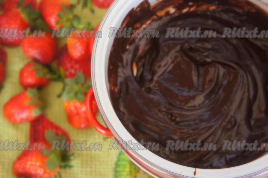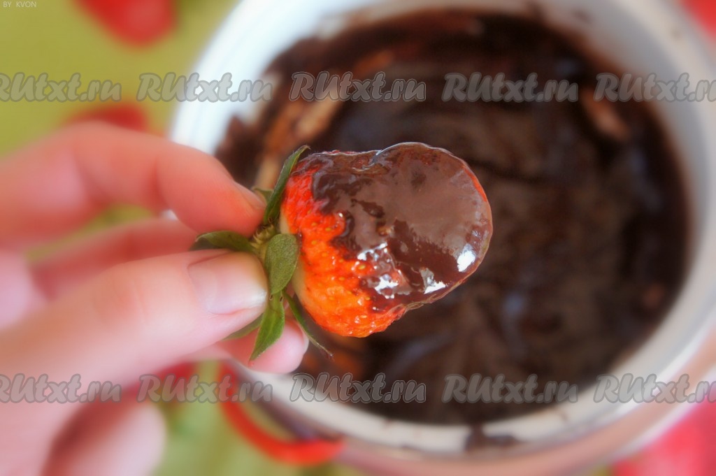 Дайте шоколаду остыть в течение 3-5 минут. Клубнику аккуратно обмакните в шоколад, чтобы шоколад равномерно покрыл ягоду.