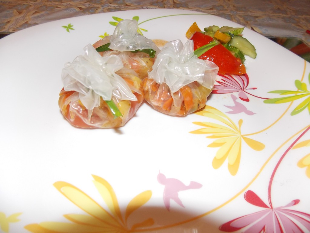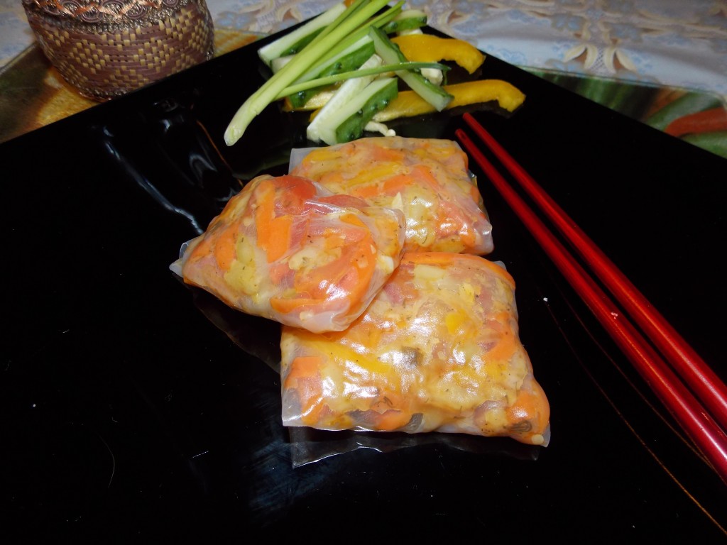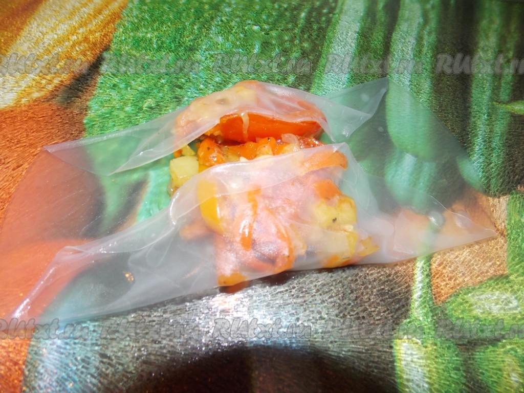 Получаются вот такие конвертики из рисовой бумаги с овощами.