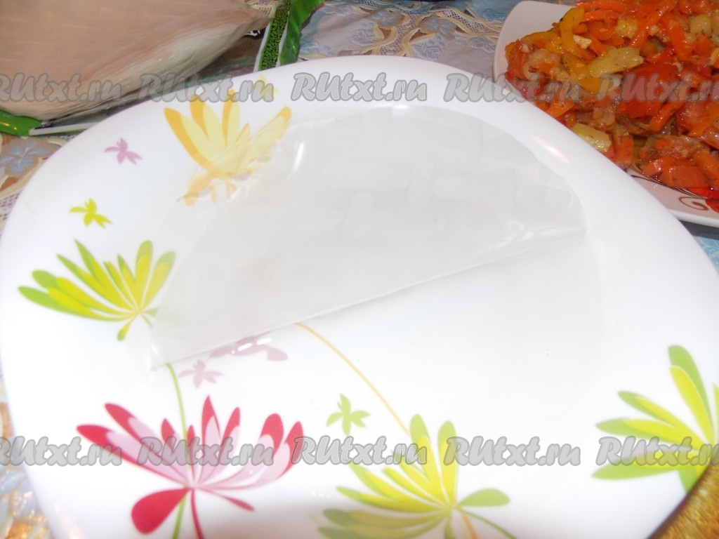 Берем стеклянную доску, слегка смачиваем ее водой (для того, чтобы когда вытащим лист рисовой бумаги из воды, он не прилип к доске). На середину листа выкладываем овощи и сворачиваем конвертом.