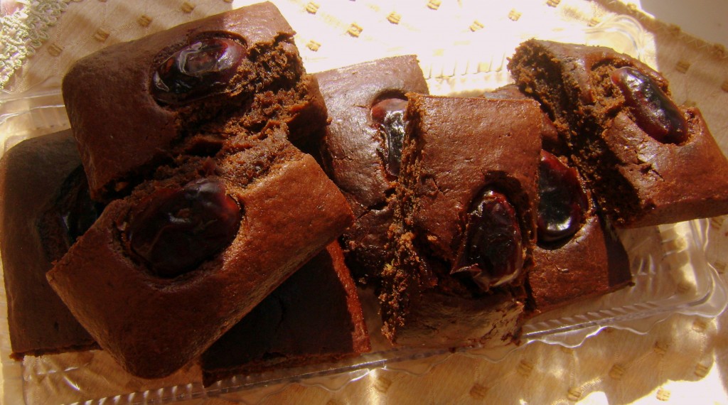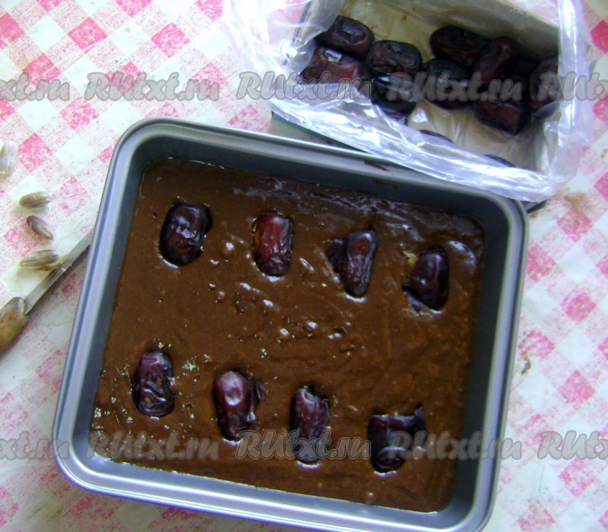 Вылить тесто на смазанную растительным маслом форму и вдавить финики так, чтобы при разрезании бананового пирога финики были по центру кусочка.