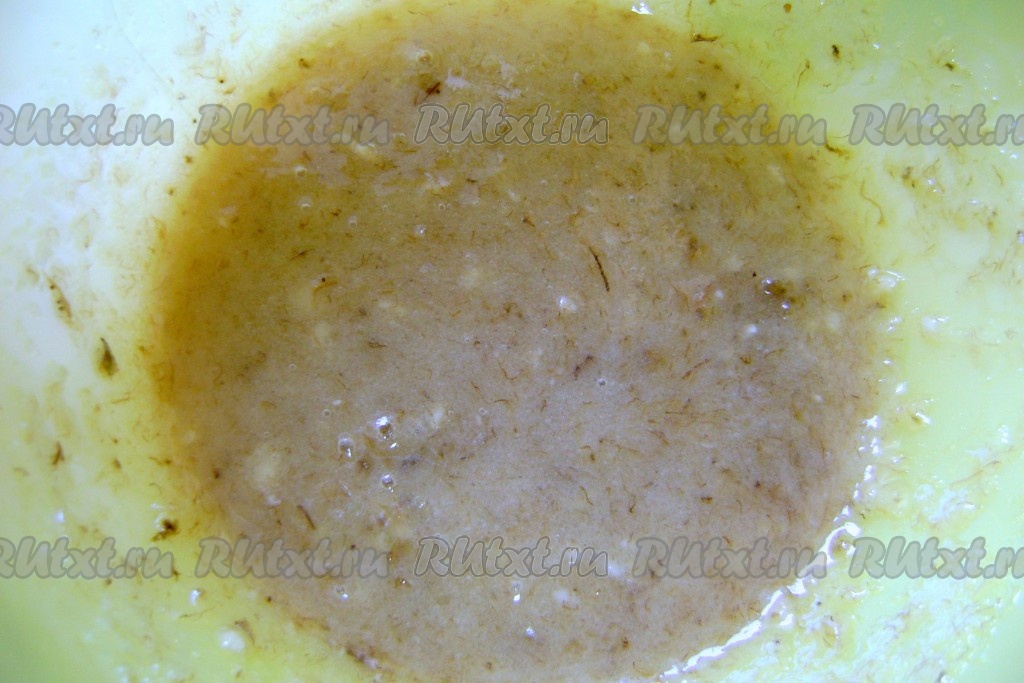 К взбитым бананам добавить мучную смесь и аккуратно порциями влить кофе, взбить. Добавить масло, взбить, недолго.