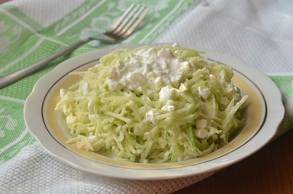 Зимой я часто делала простой салат из зеленой или черной редьки с ароматным растительным маслом. Весной захотелось внести в салат нотки свежести, я стала добавлять к редьке морковь или яблоко. Прочитав в интернете необычный для меня рецепт салата из зеленой редьки и яблока, я его приготовила. Салат понравился, он получился легким, вкусным, за счет творога - питательным.