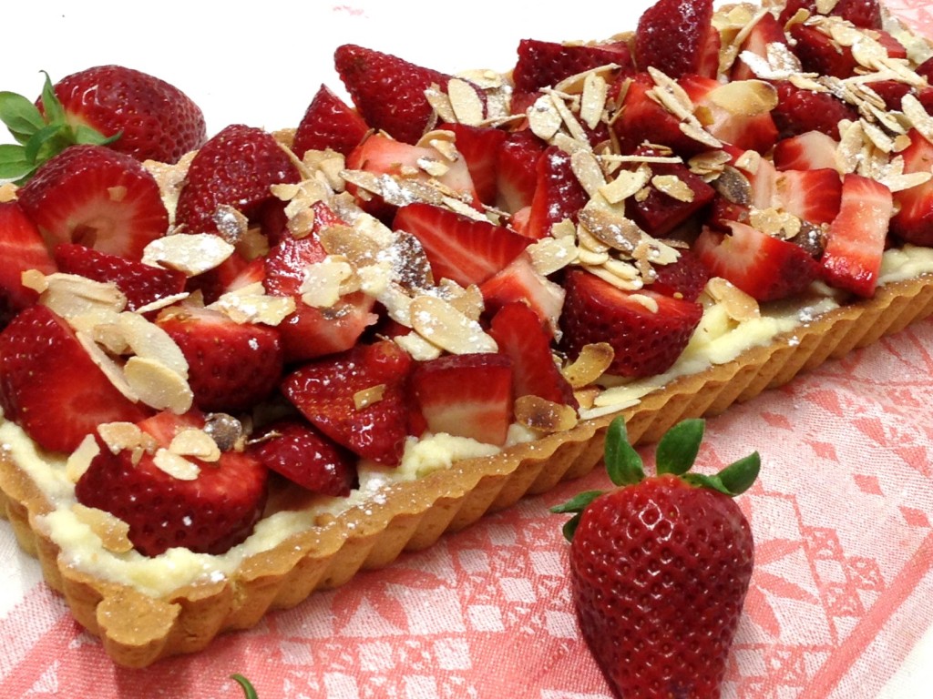 Выложить взбитые сливки на остывший корж, сверху разложить кусочки клубники, посыпать миндальными лепестками. Вкуснейший клубничный пирог готов.