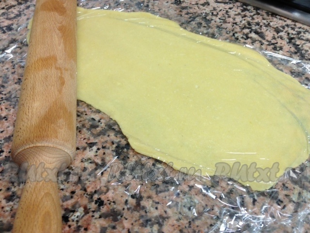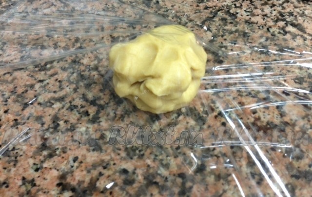 Приготовить песочное тесто. Готовое тесто скатать в шар и вынести на холод на 30 минут. Затем тесто принести, разложить на столе между двумя листами пленки, чтобы удобнее было раскатывать (тесто не будет прилипать к скалке).