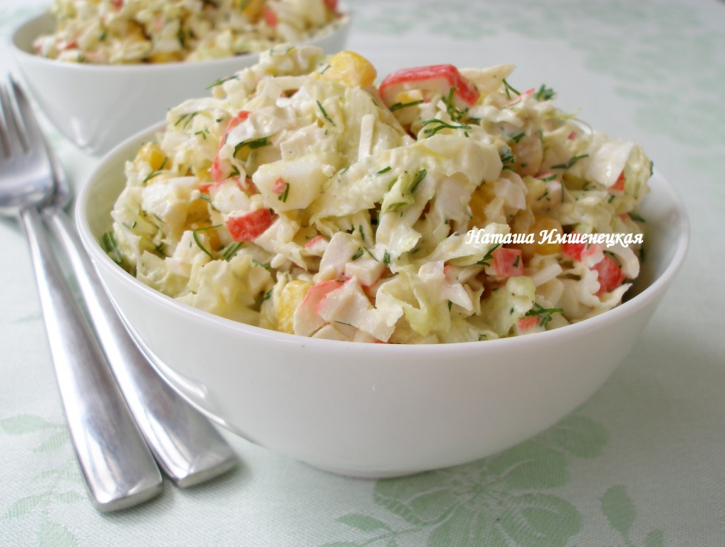 Вкусный, аппетитный салат, приготовленный из пекинской капусты с крабовыми палочками и кукурузой, подать к столу. Это простое блюдо внесёт приятное разнообразие в меню и в будни, и в праздники.