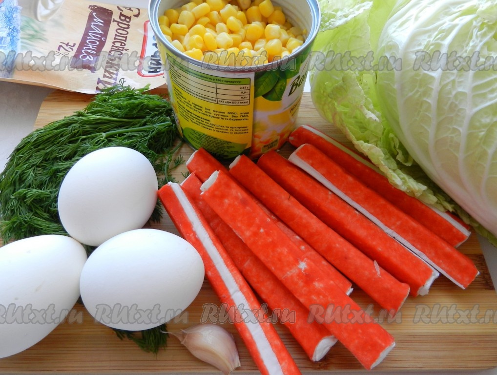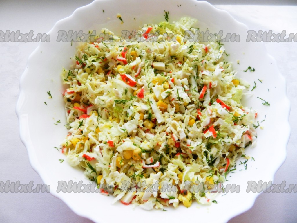 Соединить пекинскую капусту, яйца и крабовые палочки в салатнике, добавить кукурузу из банки (без жидкости).