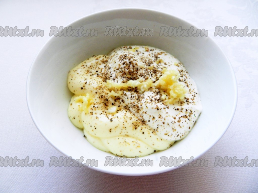 Для заправки салата из пекинской капусты с крабовыми палочками и кукурузой смешать сметану, майонез, пропущенный через пресс чеснок и чёрный молотый перец. Заправить салат перед подачей. Попробовать на вкус, если нужно, подсолить.