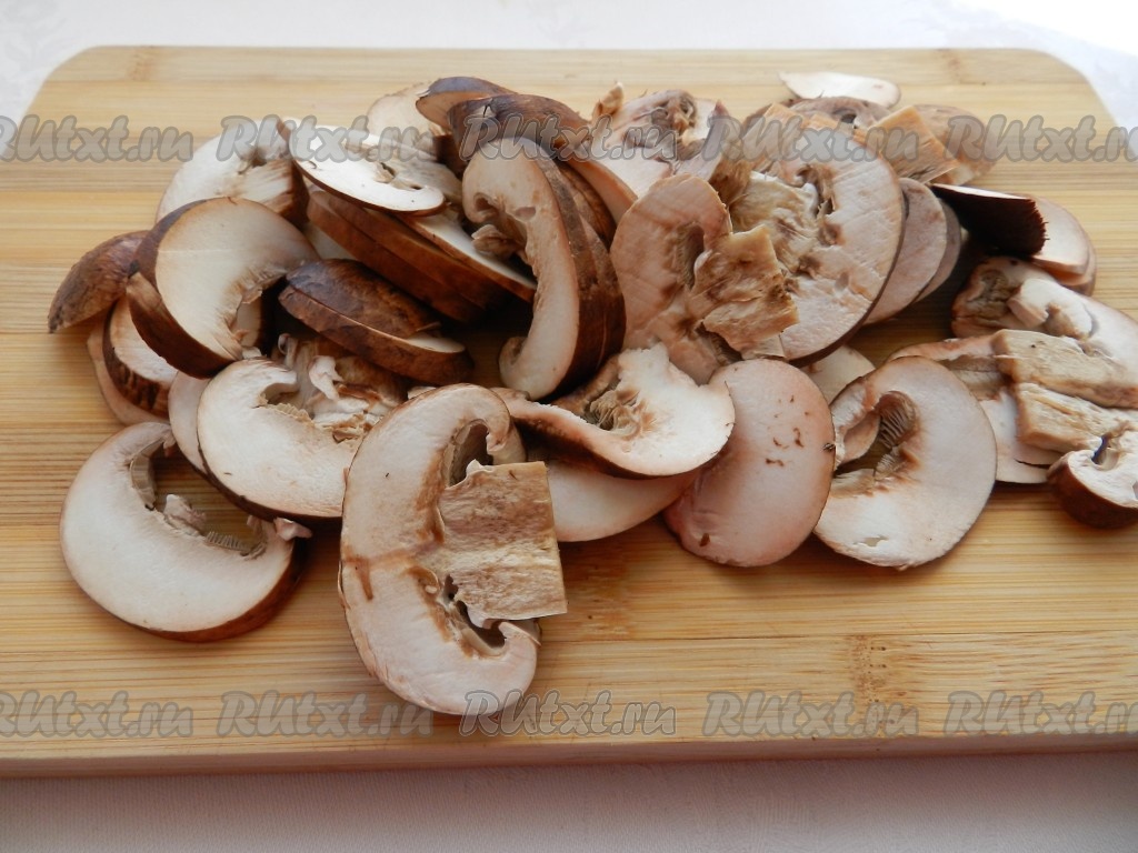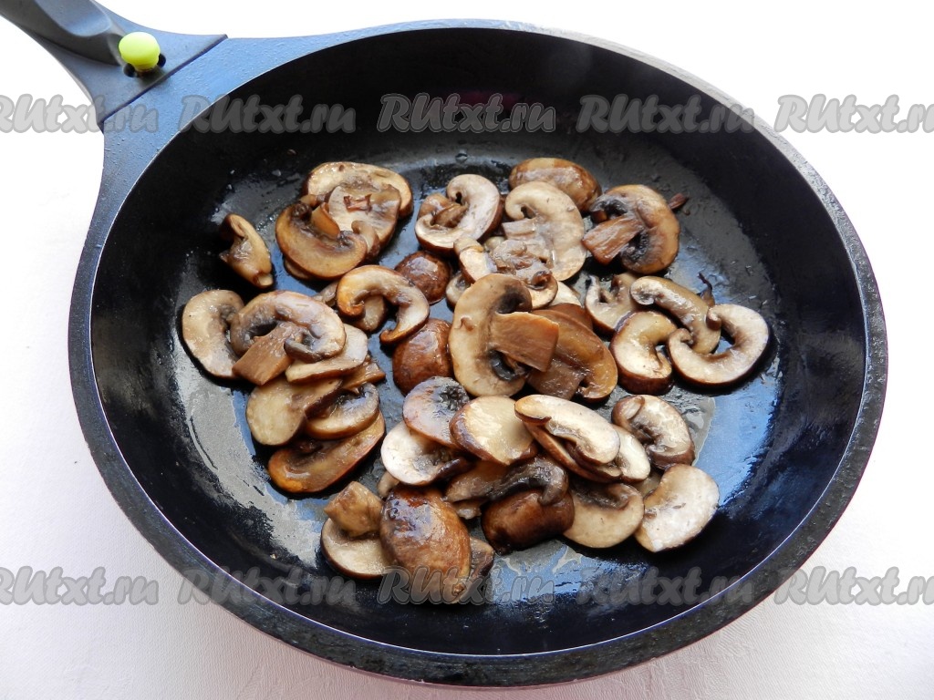 Обжарить шампиньоны в небольшом количестве растительного масла на среднем огне, помешивая, до готовности (в течение 8-10 минут).