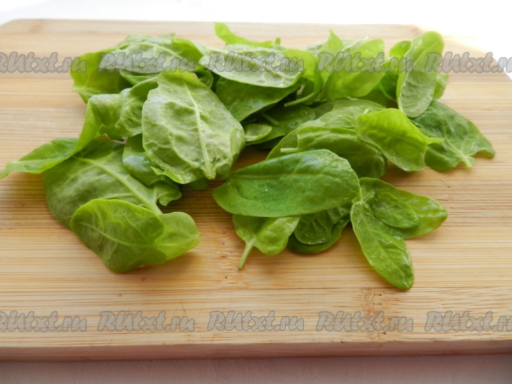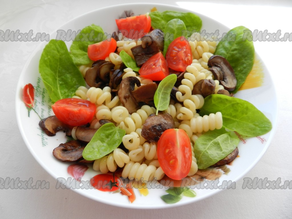 На тарелку с пастой добавить листья шпината, обжаренные шампиньоны и помидоры.