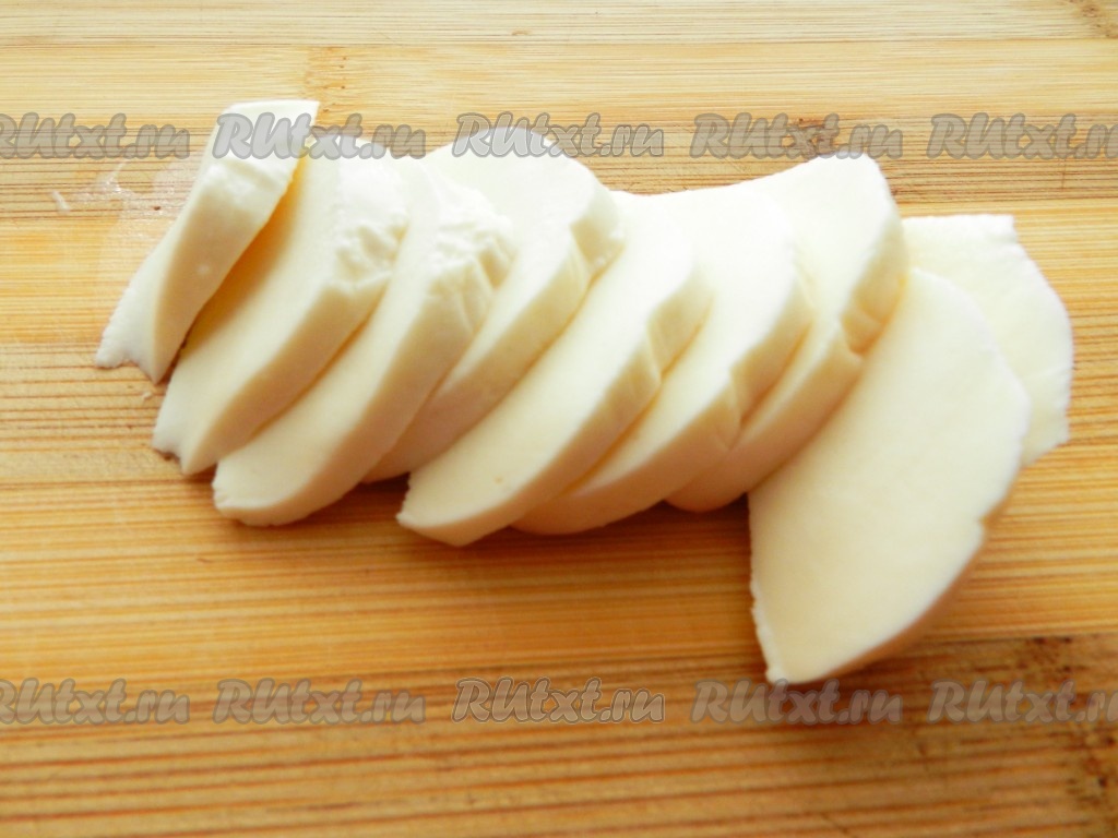 Нарезать сыр моцарелла (сыры твёрдых сортов можно натереть на тёрке).