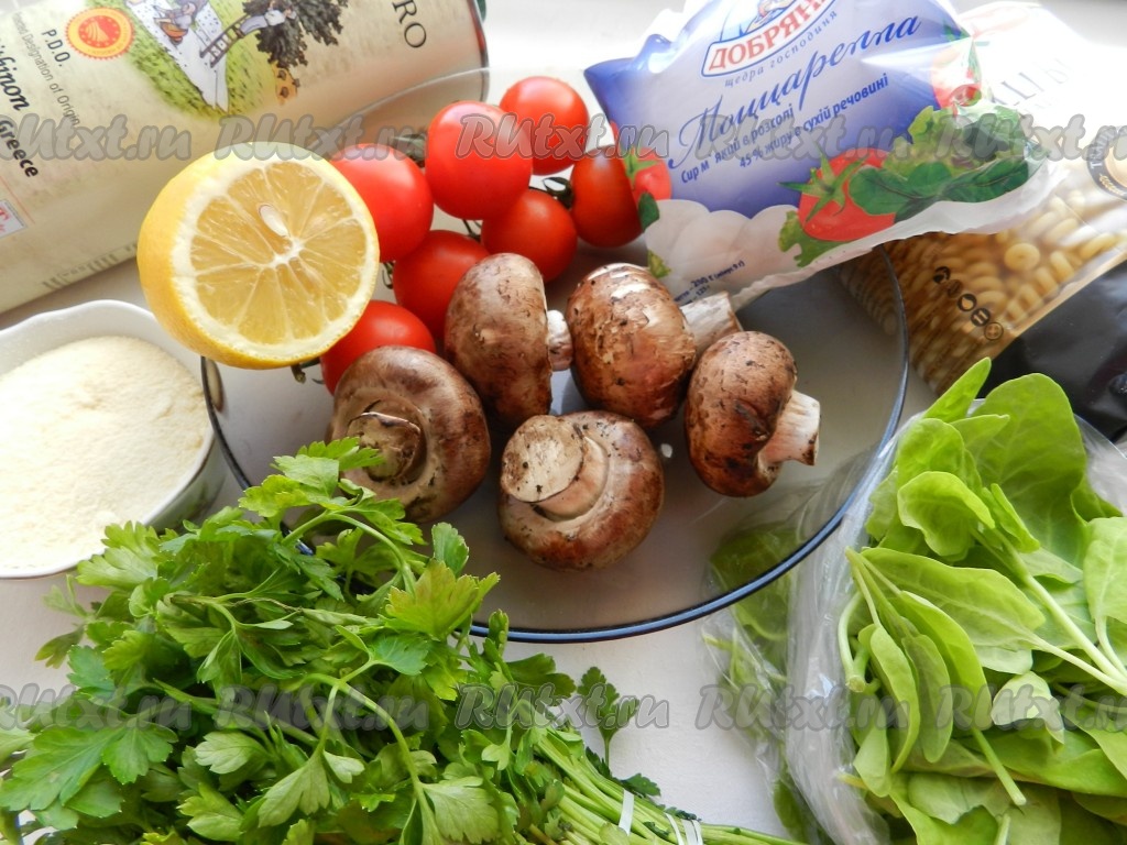 Вылить на пасту 1-2 столовых ложки оливкового масла, сбрызнуть соком лимона. Если нужно, посолить и поперчить. Выложить сверху нарезанный (или натёртый) сыр. Пасту с шампиньонами и помидорами подавать сразу же к столу. При подаче блюдо можно дополнить соусом (я дополнила соусом из измельчённой петрушки, смешанной с измельчённым чесноком и натёртым сыром). Обязательно попробуйте это вкусное, сытное, ароматное и аппетитное блюдо!