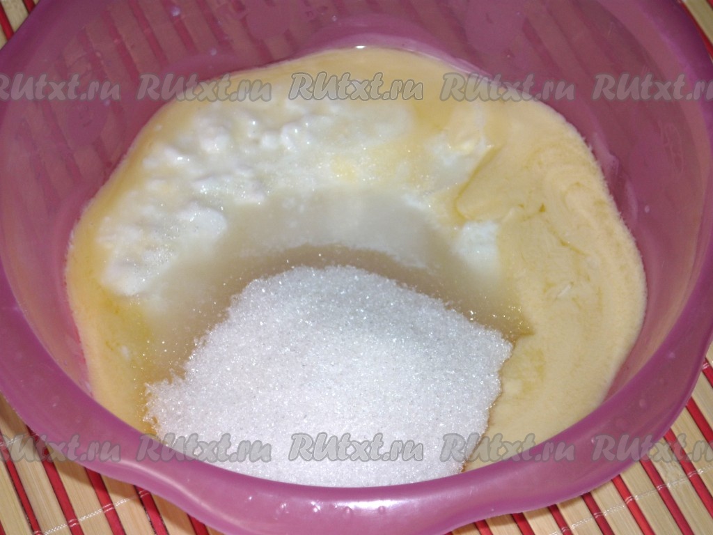 Вылить в растопленное масло кефир, добавить сахар, соду, соль,