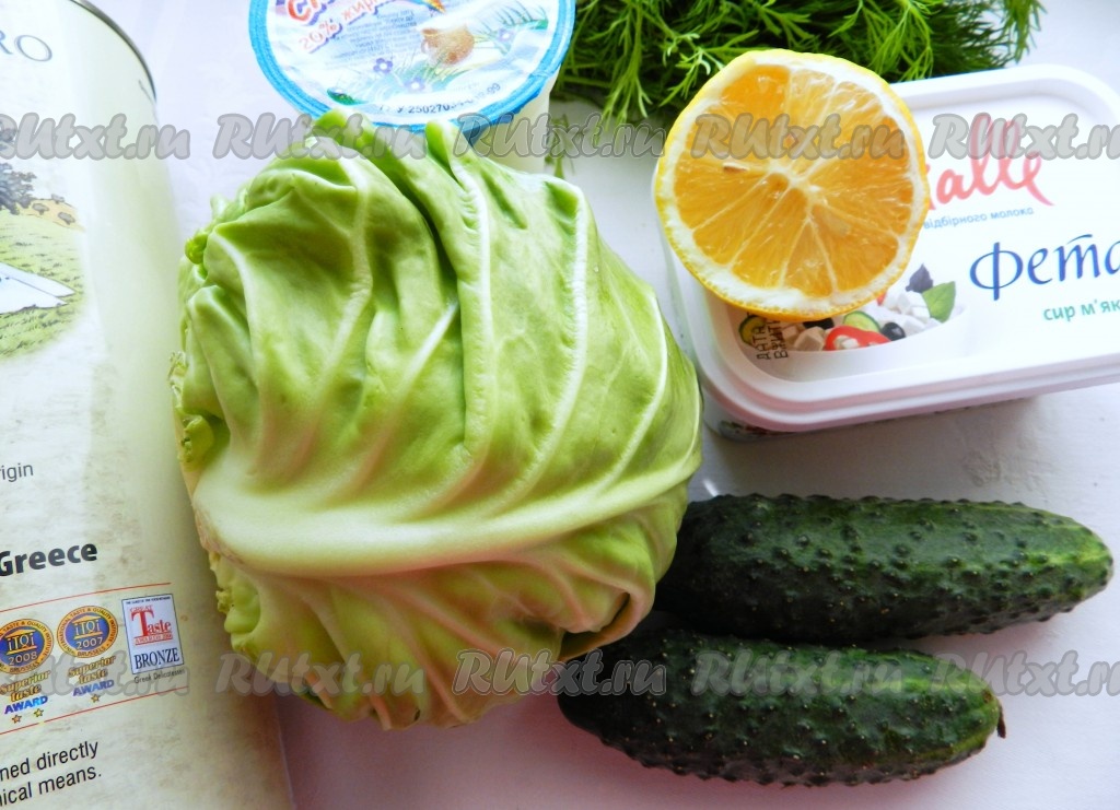 Соединить капусту и огурцы, полить оливковым маслом и лимонным соком, перемешать.