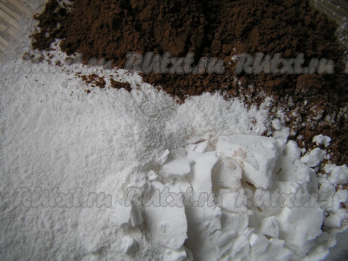 Поскольку шоколадная глазурь быстро застывает, её нужно готовить непосредственно перед нанесением на пирожное. Итак, для глазури смешать все сухие ингредиенты.