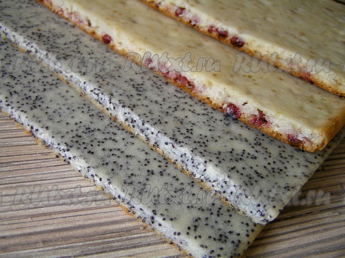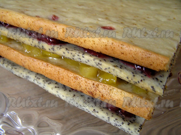 Сверху положить второй маковый "бисквит", нанести оставшийся клюквенный соус. Накрыть вторым клюквенным "бисквитом".