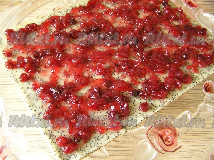 Сборка. На первый маковый "бисквит" нанести половину клюквенного соуса, разровнять.
