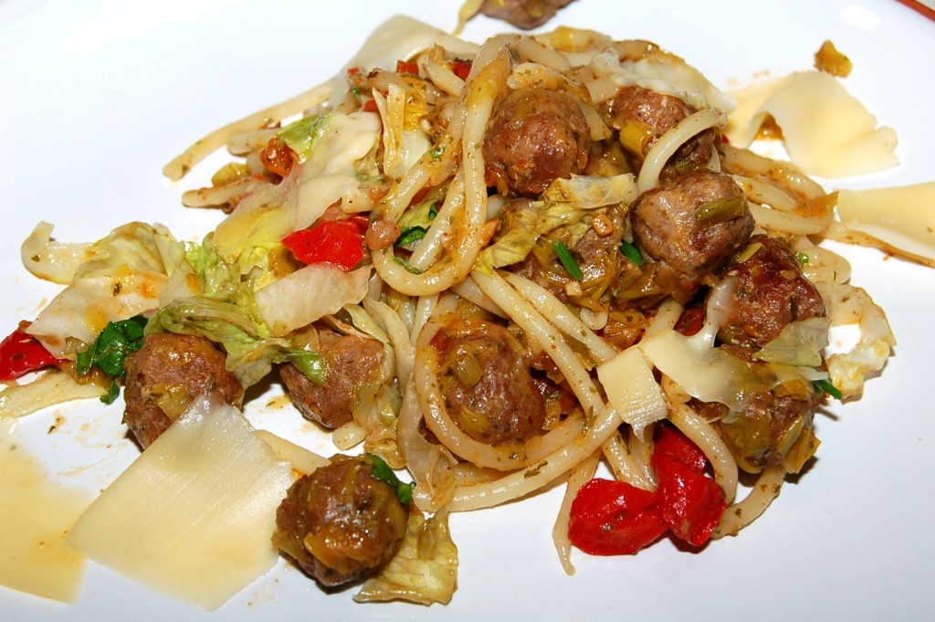 Аппетитные, сытные макароны с фрикадельками готовы. Можно подавать на стол.