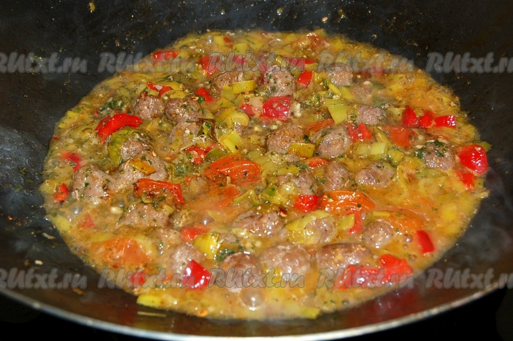 Долить горячей воды, перемешать и закрыть крышкой. Пусть фрикадельки тушатся с овощами 15 минут.