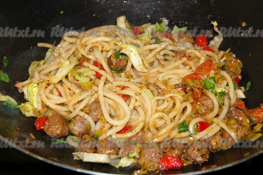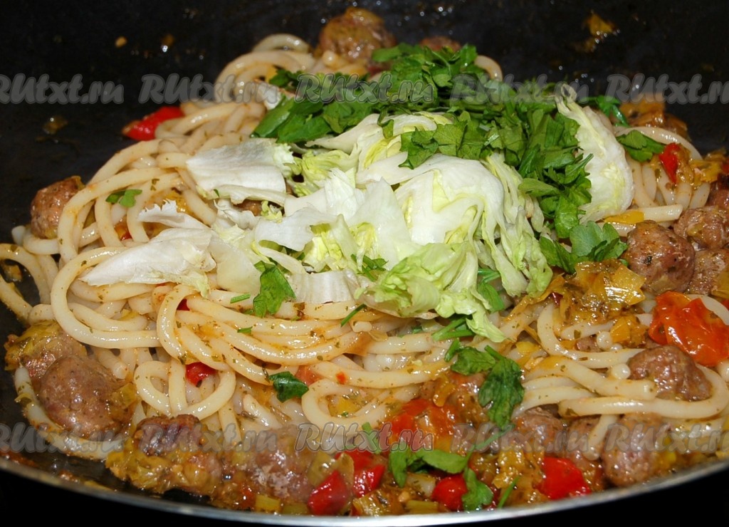 Макароны добавить в сковороду к фрикаделькам с овощами. Перемешать.