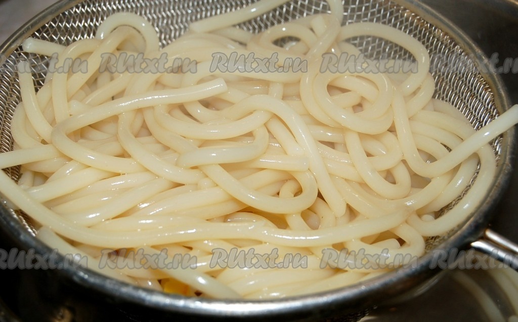 Отдельно отварить макароны, как указано на упаковке. Готовые макароны опрокинуть на сито, чтобы стекла вода.
