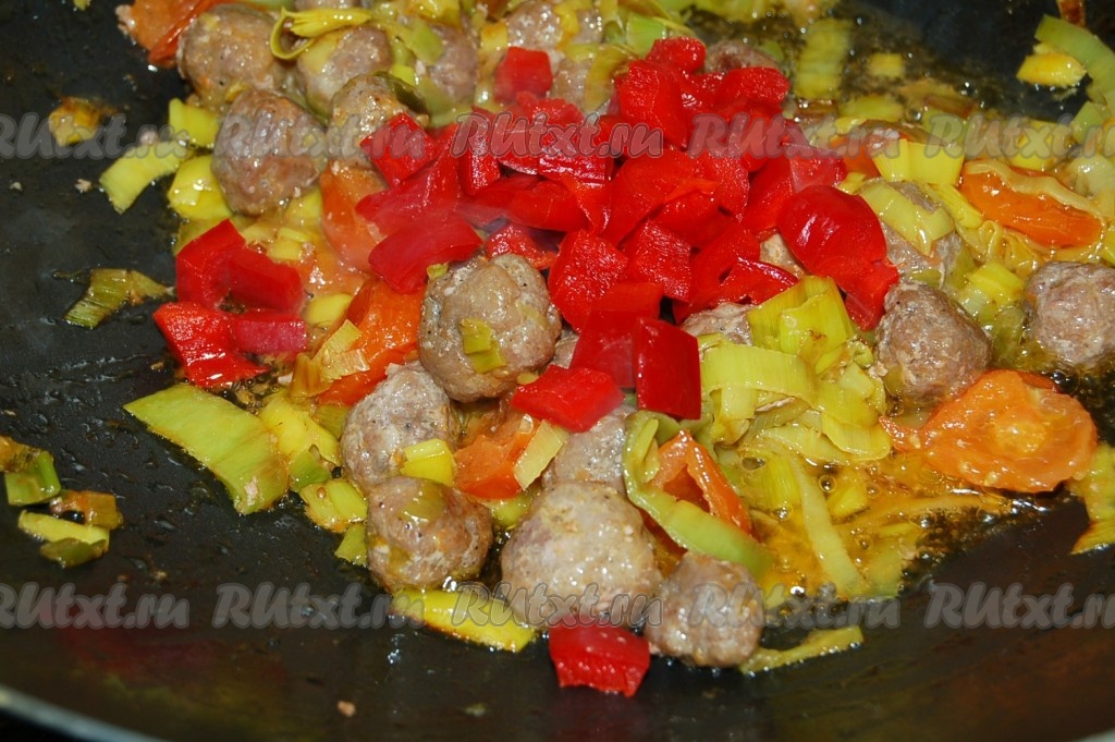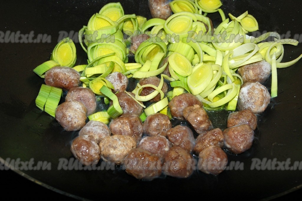 Лук порей нарезать колечками и поместить вместе с фрикадельками в сковороду с горячим растительным маслом. Фрикадельки не нужно размораживать. Если у вас свежеприготовленные фрикадельки, то их нужно использовать сразу после приготовления.