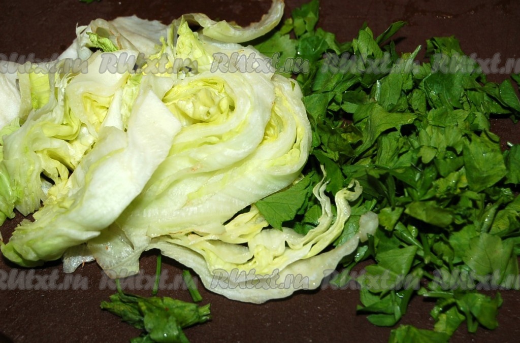 Добавить нарезанные петрушку и салат, соль, перец и специи в сковороду.