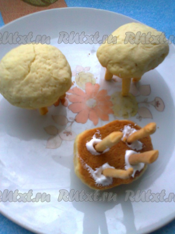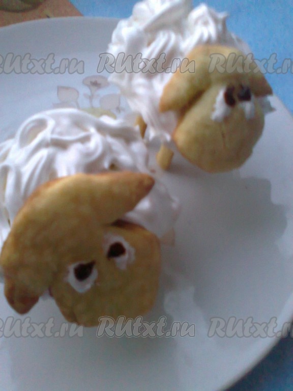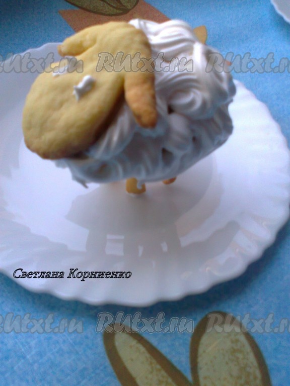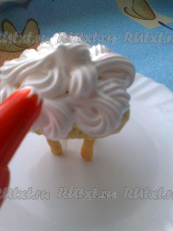 Вынимаем готовую основу из духовки. Можно сделать лежащих пасхальных барашков, тогда ножки не нужны. Вставляем ножки. Их можно воткнуть в основу, она внутри достаточно мягкая. Можно закрепить их с помощью безе.