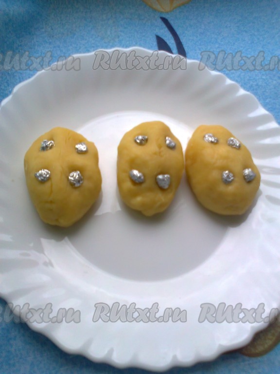 Сделать овальные шарики - это основа для барашков. Чтобы удобно было вставлять ножки, можно перед выпечкой вставить шарики из фольги (а можно и не делать, ножки достаточно твердые).