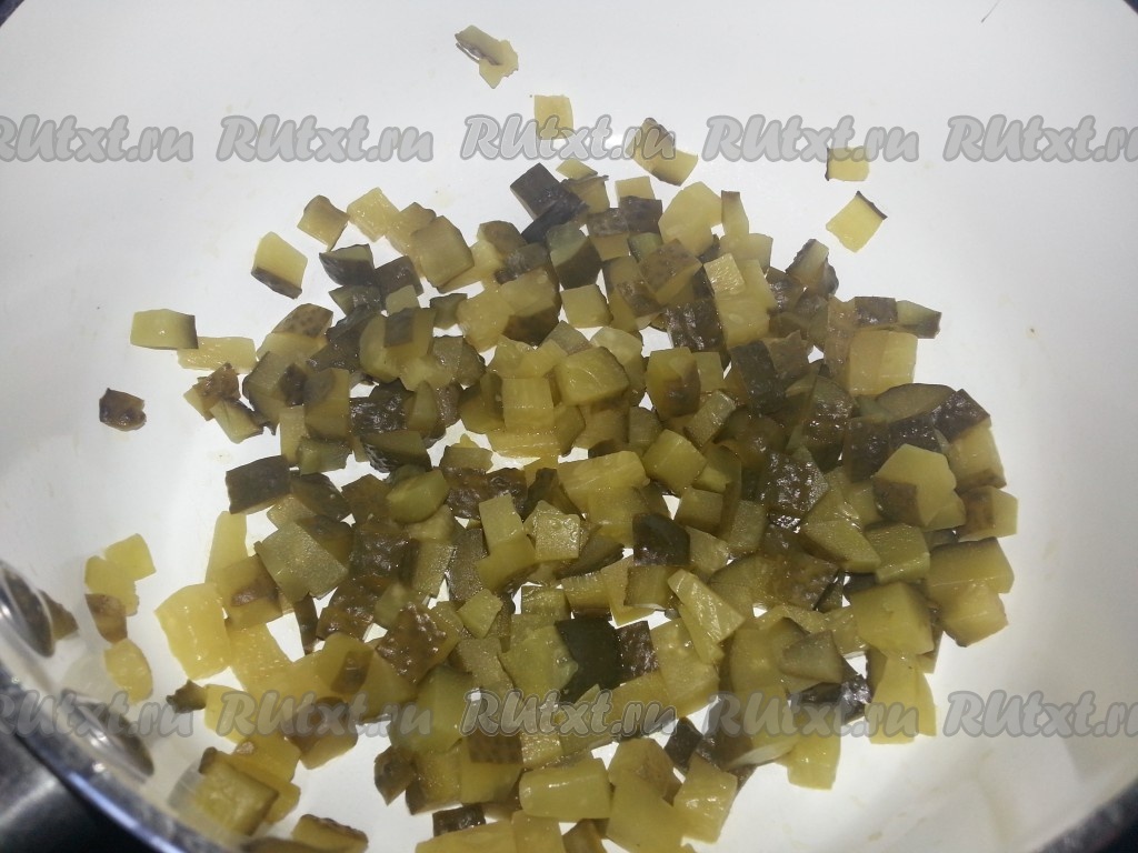 Довести до кипения, опустить в него картофель, нарезанный кубиками. Варить 10-15 минут. Тем временем пассировать огурцы, нарезанные мелкими кубиками.
