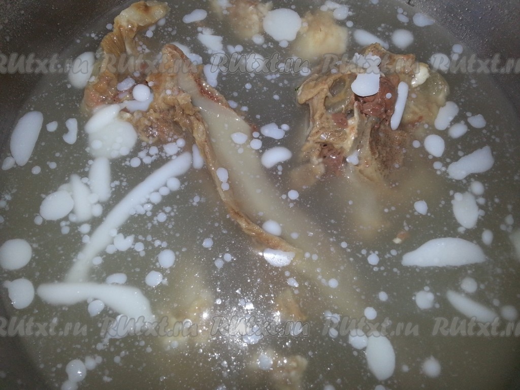Приготовить бульон. Для этого в холодную воду положить баранью косточку и варить до готовности мяса.