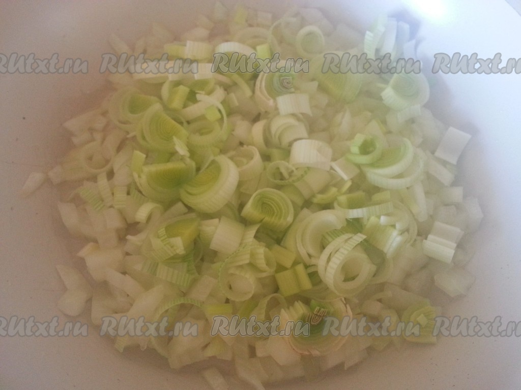 Отдельно пассировать порезанный лук репчатый и лук порей, натертую на терке морковь.