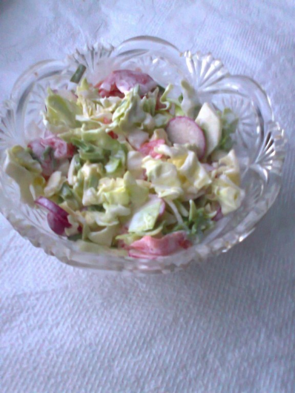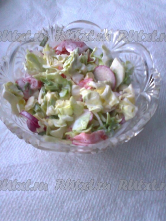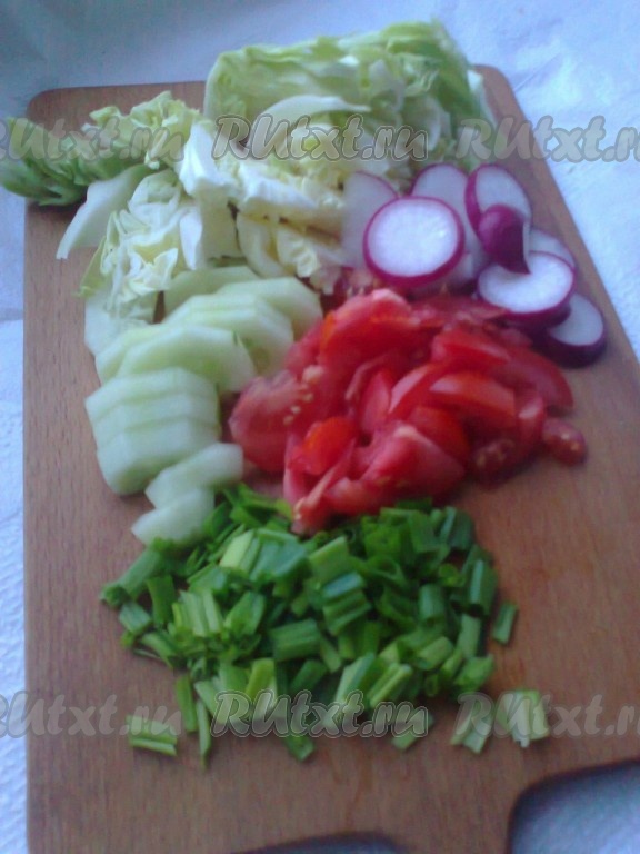 Свежую капусту нашинковать и посолить. Помидор, огурец нарезать, редиску порезать кольцами, лук и укроп мелко порубить.