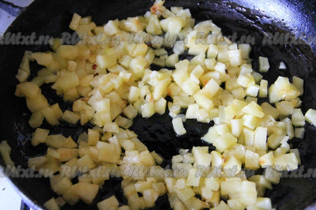 Яблоки мелко нарезать кубиками, посыпать сахаром и корицей. Полученную массу карамелизовать на горячей сковороде до мягкости яблок.
