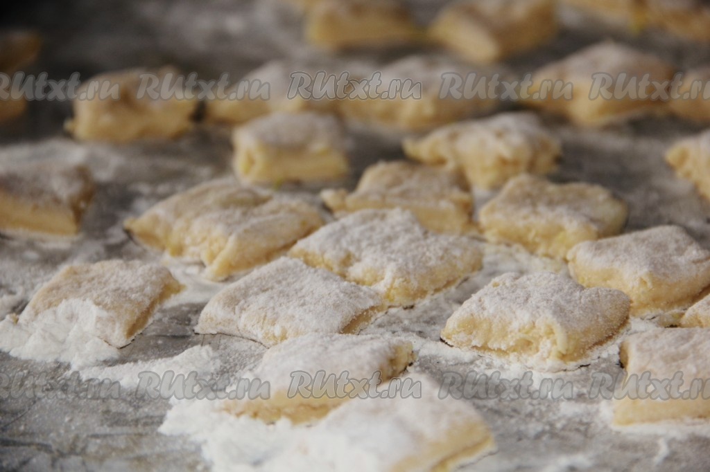 Отдохнувшее тесто достать из холодильника и раскатать в пласт толщиной в 1 см, нарезать тесто на квадратики размером в 2х2 см.